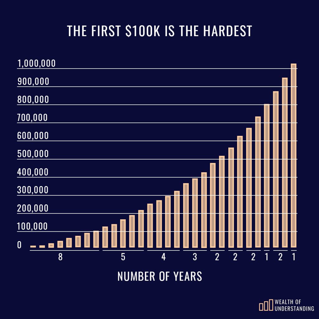 Because of the effects of compounding, money grows quicker as the numbers get bigger. And after a while it takes less and less time to hit the next milestone. Just like when you’re building a wealth of understanding, you can learn faster after you’ve learned the basics.